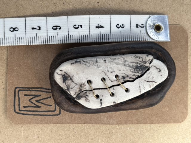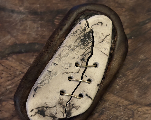 Sometimes pieces crack with the temperature shock - just as they did with this one. But I loved the patterns created so much I didn’t want to waste it. So I hand carved a wooden mount, carefully drilled both ceramic and wood with my dremel and stitched them together with wire. I finished the surface of the ceramic with a museum grade microcrystalline wax.