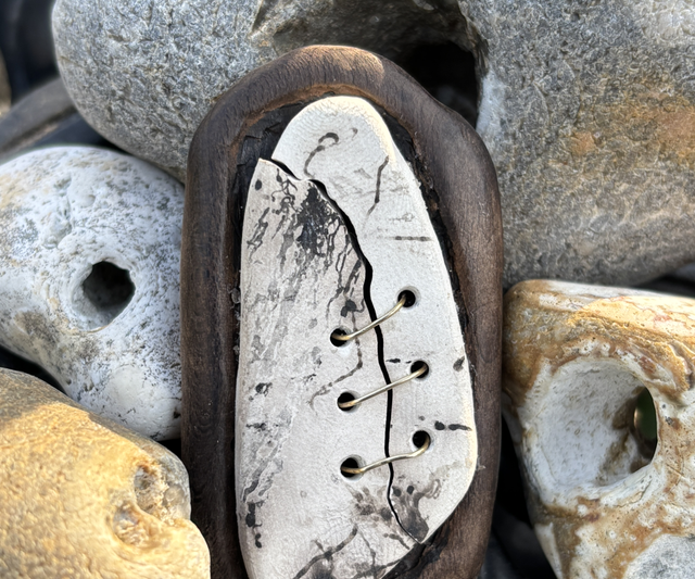 Utterly striking black and white raku ceramic and hand carved wood brooch.