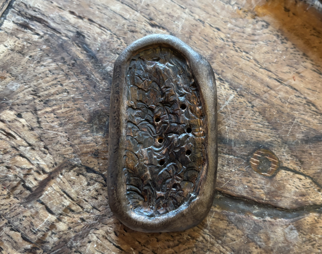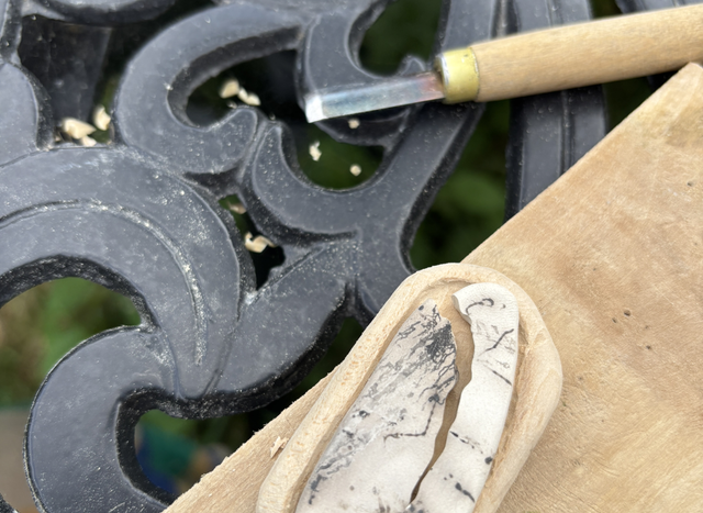When I first carved the wood (a piece of line from my parents’ farm) I felt it was too light in colour - so made it darker with my pyrography pen and then a gas flame before burnishing it.