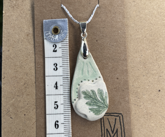 A delicately beautiful ceramic pendant. Formed with white clay and imprinted with leaves from my garden this piece in the collection features additional texture and layers. Gently coloured with green underglazes.
