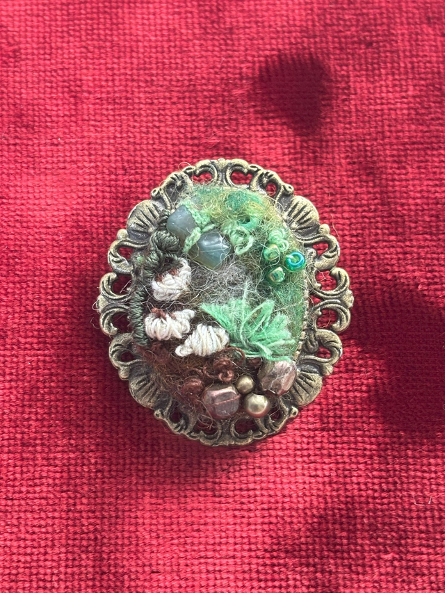 All materials used in making this piece have been sourced second hand - they include felt and wool roving from a damaged hat found in a charity shop, embroidery threads purchased from vinted, beads and stone chips salvaged from broken jewellery. The setting was purchased from another artist who was "destashing".