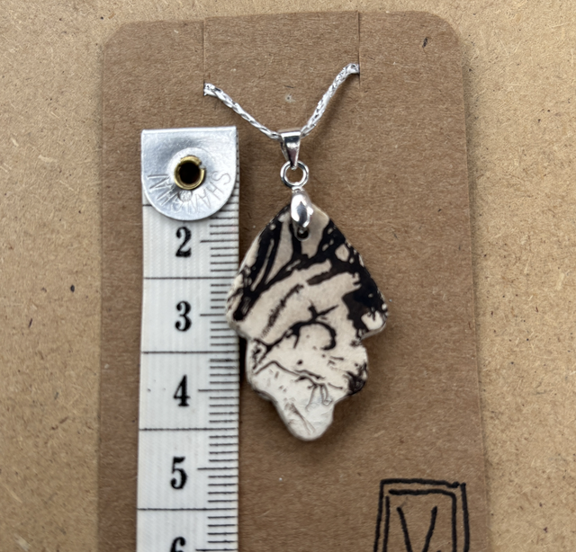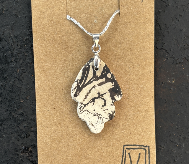 Striking black and white ceramic pendant - made with a white clay which was bisque fired in the community kiln in Grove Park, Lewisham, sanded, and then re-fired - carefully taken from the kiln whilst still red hot before “combustibles” - in this case feathers - were applied. While still so hot the carbon from the burning fibres fuse with the clay to form unpredictable and energetic marks. I finished the surface of ceramics with a museum grade microcrystalline wax.